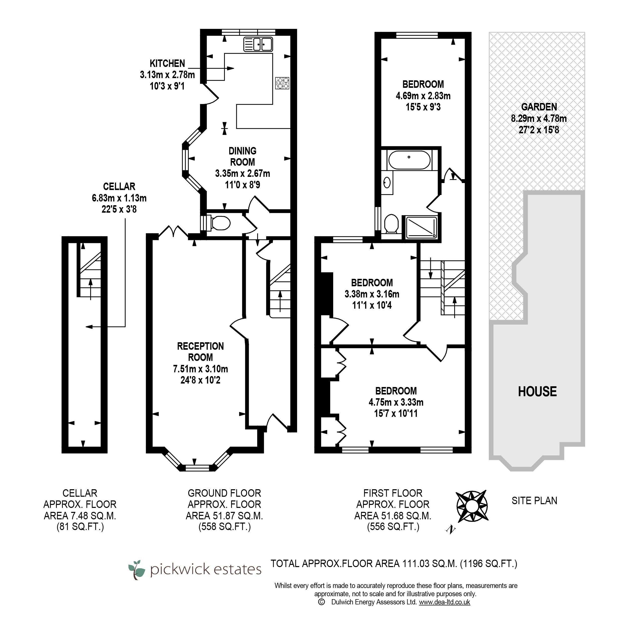 At the rear of the house is a spacious kitchen diner with full underfloor heating, offering plenty of space for a dining room table and chairs next to a bay sash window that looks out to the side return.