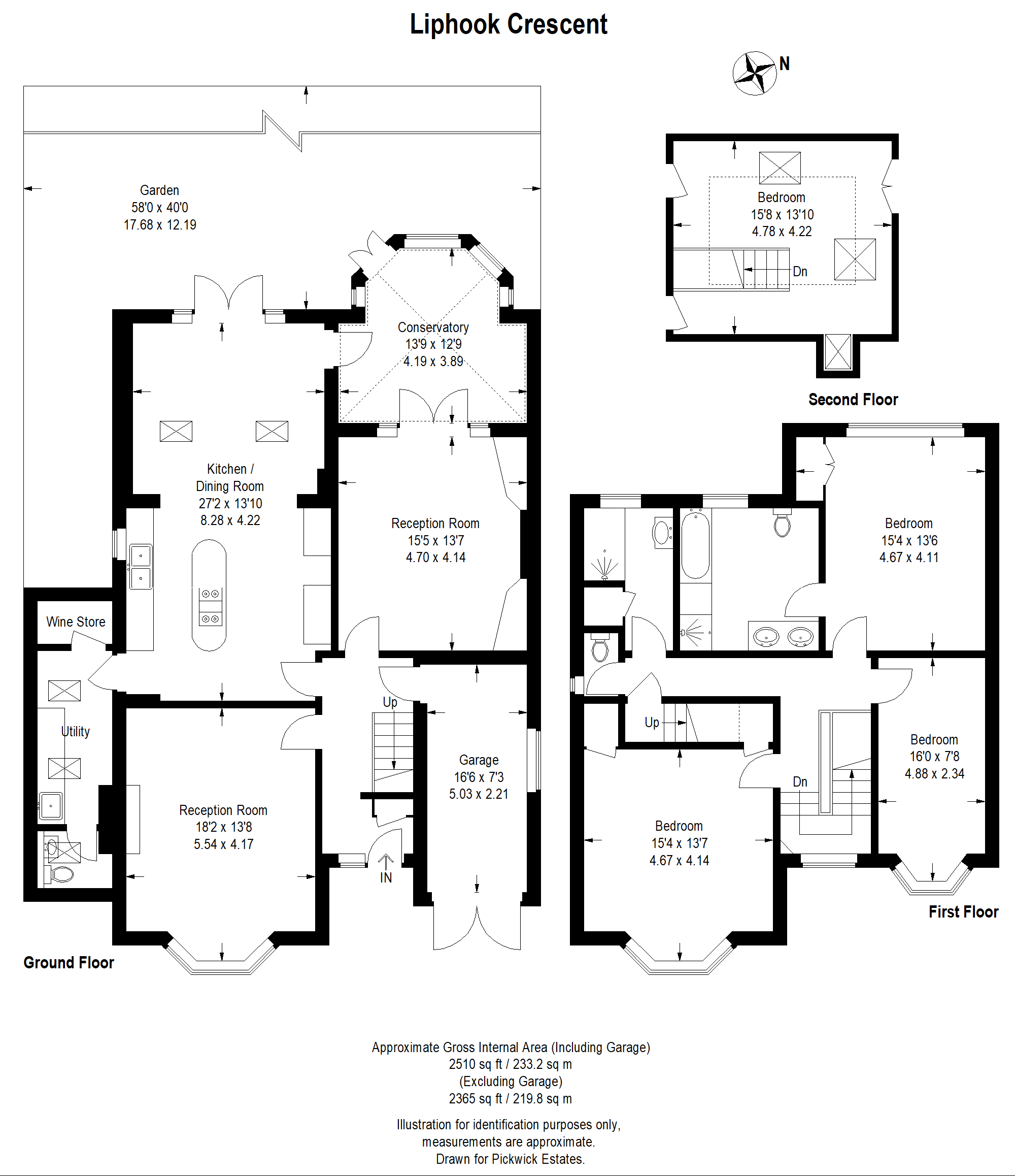 Both the conservatory and kitchen dining room offer direct access to the private rear garden. The garden has beautifully maintained and is a very good size, almost as wide as it is long! (approx. 58' x 40’ 17m x 12m). There is a raised decked patio area closest to the house which has lovely views and steps leading up to a lawn surrounded by mature trees, shrubs and plants.