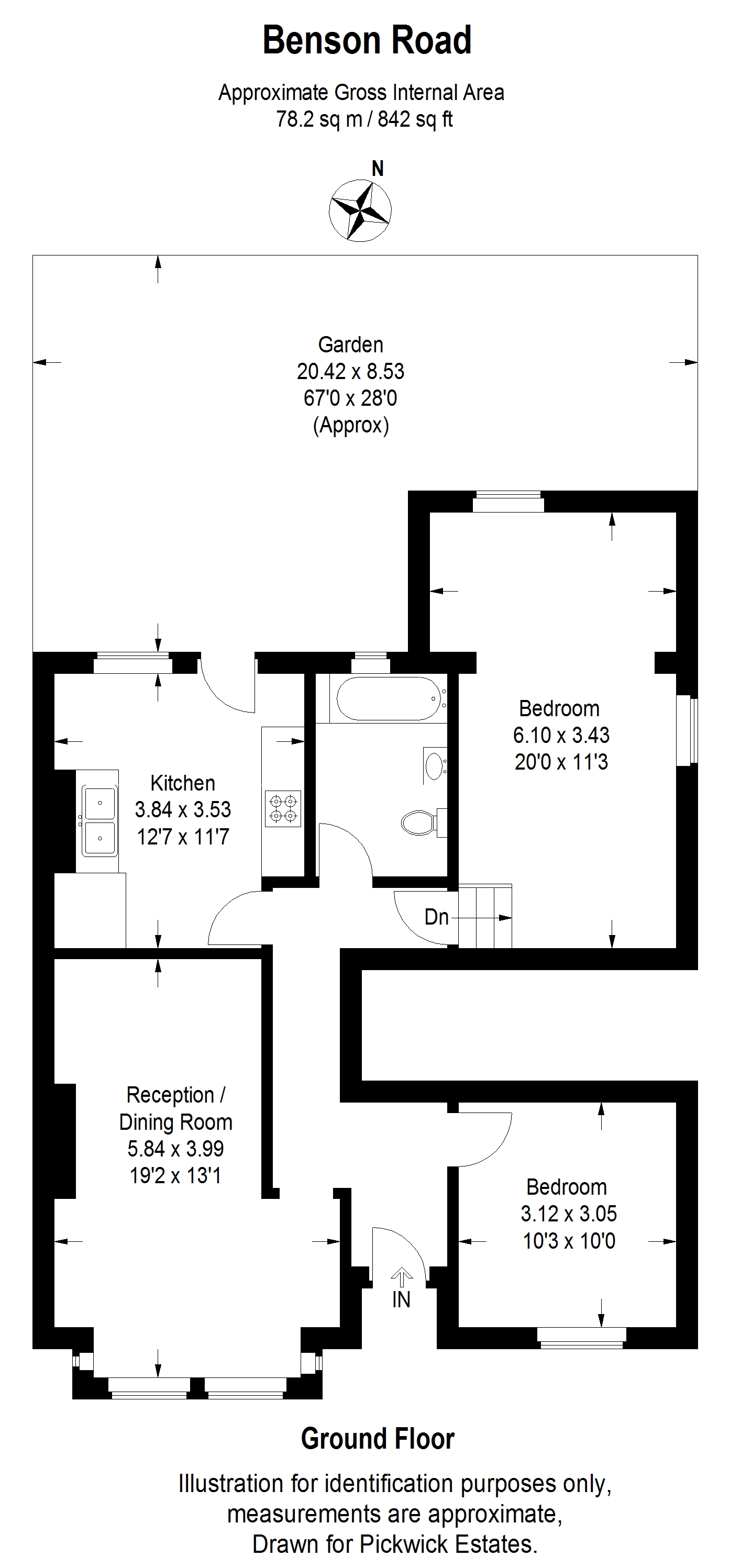 The garden is the star of the show as it’s the whole width of the house 28ft (8.53m) and is 67ft long, with side return access from the front. There is a patio area closest to the house, perfect for alfresco dining in those warm summer evenings. Beyond this is a large lawn surrounded by mature plants and trees.