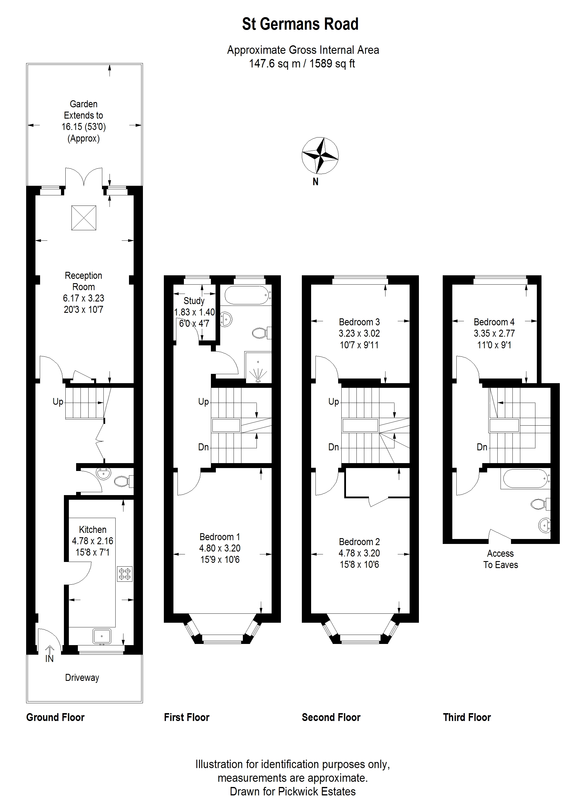 An extensive 4-bedroom, semi-detached family home, offering 1589 sqft over four floors, two bathrooms, a private south facing rear garden and off-street parking. Built circa 2000 this modern family home has so much to offer! Upon approach the pair of semi-detached houses have a nice kerb appeal, set well back from the street by a large shared front driveway. Upon entry there is a long entrance hall that offers plenty of storage beneath the stairs as well as a separate guest toilet. At the front of the house is the kitchen that was fitted last year with plenty of white wall and base mounted units, housing an integrated oven with induction hob and a sink that sits neatly beneath the front window. There is also plenty of worktop space with stylish white metro tiled splash backs and space for a washing machine, dishwasher and fridge freezer. At the rear of the house there is a spacious reception room that has ample space for a dining area and a living area. The rear part of this room has a vaulted ceiling with a skylight above that gives an airy feel along with plenty of natural light combined with the French doors that lead to the garden. Nearest to the house is a raised deck from the longe area, a sun trap thanks to the southerly facing aspect and ideal for al fresco dining in the warmer months. Steps lead down to another patio area that is tiers down to an extended lawn. At the far end of the garden there are some mature trees and space for a storage shed. On the upper three floors are the bedrooms and bathrooms that service the house. The first-floor front bedroom is a versatile space and could also be used as a second reception room thanks to its generous size and bay window to the front. To the rear of this floor there is an office/study room that looks out to the rear garden. Next to this is the family bathroom which benefits from a walk-in shower enclosure as well as a separate bath, a toilet and wash hand basin. A frosted window to the rear offers natural light and ventilation. The second floor has a large principal bedroom that has a bay window to the front and a walk-in wardrobe. Also on this floor is a good size double bedroom that has lovely far-reaching southerly views towards Kent and Surrey. The third floor makes a great guest suite as there is a good size double bedroom to the rear with amazing views and a bathroom to the front that services this floor. There is also lots of additional storage in the eaves and the loft space. St Germans Road is within easy walking distance of a number of excellent local pubs and restaurants as well as access to a selection of outstanding schools and nurseries with a health centre at the end of the road and a number of local parks such as the popular Blythe Hill Fields with panoramic London views. It is a 10/15 minute walk to one of the four local mainline stations at Forest Hill, Honor Oak Park, Catford & Catford Bridge, with trains to Charing Cross, London Bridge, Gatwick and Blackfriars etc. Forest Hill and Honor Oak Park stations also benefit from the Overground service with train services to nearly every part of London.
