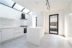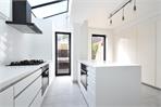 At the rear, the kitchen has been extended into the side return and is filled with natural light thanks to its southerly aspect and skylights above. Sleekly finished in a monochrome palette, it offers integrated appliances, excellent storage, and a versatile entertaining space.