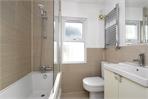 Upstairs, the first floor offers three bedrooms and a family bathroom, all tastefully decorated. The principal bedroom sits at the front with floor-to-ceiling wardrobes and a bay window with plantation shutters overlooking the playing fields. Also on this level are a further double bedroom and a smaller double with fitted wardrobes and views across the garden and Blythe Hill Fields. The bathroom is smartly finished, with a shower over the bath, vanity unit, heated towel rail, and a frosted window for natural light.
