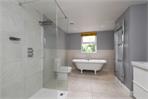 On the half-landing, the luxurious guest bathroom includes a roll-top bath perfectly positioned beneath a window with leafy views, a separate walk-in shower, vanity unit, WC, and heated towel rail.