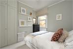 Adjacent is the principal double bedroom—bright and well-proportioned—with a bespoke floor-to-ceiling fitted wardrobe that makes use of the ceiling height, plush carpeted flooring, and views over the garden through a double-glazed window.