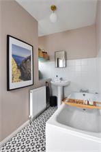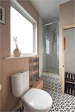 The bathroom includes a shower enclosure as well as a freestanding bath, toilet, and wash hand basin. It features patterned antique-style flooring, a heated towel rail, and two frosted windows providing both light and ventilation.