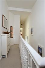 Set back from the street behind a walled front garden, the property is entered on the ground floor with stairs leading up to a wide landing that connects all rooms.