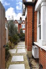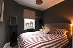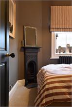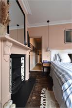 The principal bedroom spans the full width of the front of the house and features fitted wardrobes, high ceilings with cornicing, restored original floorboards, a sash window with shutters and a feature fireplace. The two further bedrooms are both well-proportioned doubles, positioned to the rear of the property.
