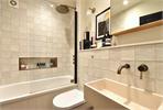 The family bathroom is finished to a high standard, featuring contemporary sanitaryware, elegant wall tiling, antique brass fittings and a wall-mounted mirrored vanity unit.