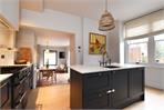 To the rear is a superb open-plan kitchen and dining room, perfectly suited to modern living, along with a downstairs guest cloakroom. The kitchen is fitted with stylish Shaker-style cabinetry, quartz worktops and fully integrated appliances, with a central island housing the sink and a range cooker positioned to one side.