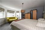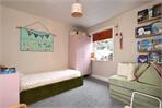All three bedrooms are well-proportioned doubles. The principal bedroom features a large bay window overlooking the front courtyard, the second bedroom benefits from a patio door providing direct access to the rear garden, while the third bedroom is positioned at the front of the property overlooking the entrance courtyard.