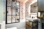 The recently refurbished family bathroom is both luxurious and practical, finished with striking terrazzo tiled walls that add character and colour around the bath and wash hand basin, all complemented by contemporary matte black fittings.