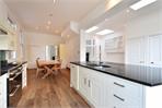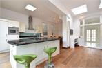 Stretching over 6 metres across the rear of the house, the wider-than-average kitchen breakfast room is a superb family and entertaining space. Floor-to-ceiling bi-fold doors and multiple skylights create a wonderfully bright atmosphere and frame views over the landscaped garden. The kitchen features a central island with granite worktop and deep bowl sink, extensive fitted storage, and a Stoves range cooker. A concealed utility cupboard and guest WC add practical convenience, while solid wood flooring flows seamlessly throughout.