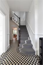 A few steps lead to an elegant porch with an original French door, opening into a grand entrance hall featuring striking black-and-white tiled flooring, high ceilings, cast-iron radiators and a sweeping staircase.