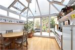 To the rear of the house is a generous open-plan kitchen and reception room, featuring wood flooring and flowing seamlessly into a bright conservatory with direct access to the garden. The contemporary Wren kitchen is fitted with integrated appliances, Quartz worktops, an Insinkerator hot water tap and a newly installed water softener.