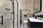 The rear bedroom is served by a sleek en-suite shower room, recently renovated and finished in a striking black-and-white scheme, complete with a large walk-in shower, heated towel rail, contemporary WC and vanity unit, all complemented by matte black fittings.