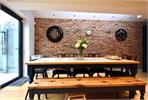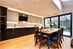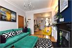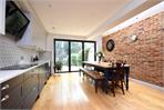 To the rear, a side-return kitchen extension has transformed the ground floor into a superb open-plan kitchen/dining room with underfloor heating, ideal for entertaining. The shaker-style kitchen features integrated appliances, acrylic worktops, a butler sink and geometric tiled splashback, complemented by an exposed brick wall and skylights. Floor-to-ceiling bi-fold doors open directly onto the garden.