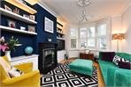 The double reception room offers high ceilings, a feature fireplace, fitted alcove storage and a large bay window fitted with plantation shutters, creating a bright and elegant living space.