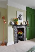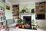 To the front of the house, a beautifully proportioned reception room spans the full width of the property, offering a cosy yet elegant setting. It features soft carpeting, a charming working fireplace, bespoke shelving within the alcoves and a sash window overlooking the front garden.
