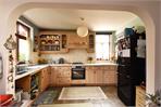 The kitchen is set just off the dining area through a wide arched opening, with dual-aspect windows allowing for an abundance of natural light. Fitted in an L-shape, it offers ample worktop space and cabinetry, complemented by tiled flooring and splashbacks, with an additional doorway providing convenient access back to the entrance hall.