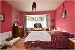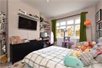 There are three well-proportioned double bedrooms, all retaining period features including high ceilings and stained-glass detailing. The principal bedroom is particularly impressive, featuring a curved bay window mirroring the reception room below.