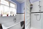 The family bathroom has been tastefully styled in a classic monochrome palette, in keeping with the home’s character, and includes a separate bath, large shower enclosure with glass brick wall, and wash hand basin. A frosted window provides natural light and ventilation, while the WC is positioned separately alongside a generous airing cupboard.